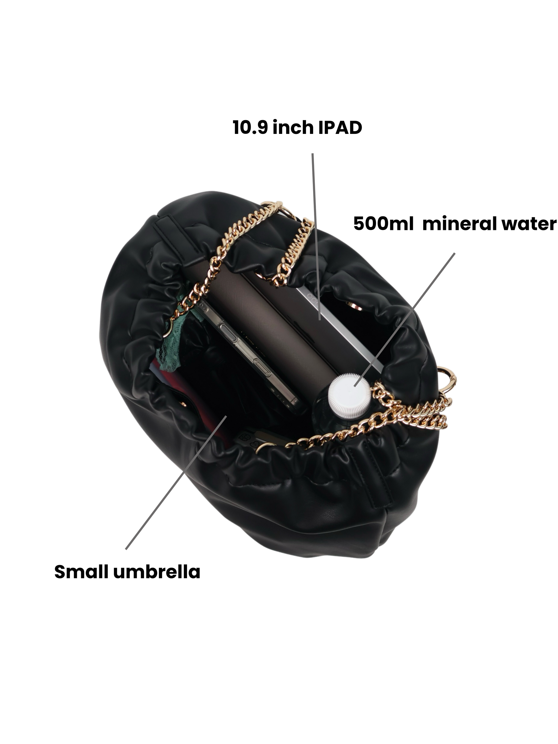 - Able to fit in Ipad / 19cm long purse/ 500ml water bottle / small umbrella and etc